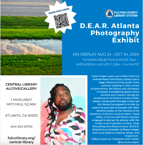 In 2023 I was selected as the Fulton County Public Library Artist in Residence. During this 3 month residency I worked out of a studio in the Central Branch, and worked to create a keystone project. Hosting open studio hours I invited the community, the public and local figures to sit and be photographed with their favorite. books. The residency culminated with my solo show “D.E.A.R. Atlanta” at the central library branch in 2024.