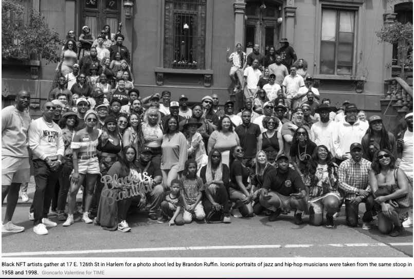 I had the privilege of being one of the artist featured in TIME Magazine’s Black NFT Artist article. This was a unique and great honor to be identified and included as one of the artist of color using the emerging Blockchain technology. The photo accompanying the article was a reenactment of the iconic great day in harlem photo which featured jazz legends like Dizzy Gillespie, Count Basie and more. As an artist and a native Harlemite, it was an honor to be a part of the piece and to pay homage to a foundational text. The legacy of the photo is perhaps only dwarfed by the legacy of a publication like Time Magazine.